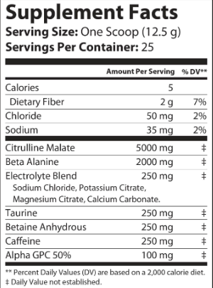 Suggested Use: Mix 1 scoop with 6-8 ounces of cold water and consume 30-45 minutes before your workout.