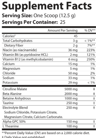 Suggested Use: Mix 1 scoop with 6-8 ounces of cold water and consume 30-45 minutes before your workout.